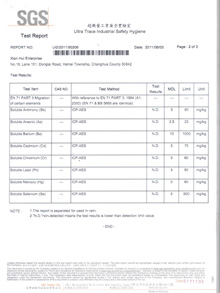 賢輝造漆依照客戶需求提供符合「SGS八大重金屬檢測」的塗料,包括歐規EN71及美規重金屬檢驗報告。為了迎合客戶的要求,賢輝造漆可以為提供的塗料範圍,包括金屬塗料、塑膠塗料、碳纖維塗料、陶瓷塗料及客製化塗料等等,提出其檢驗報告。